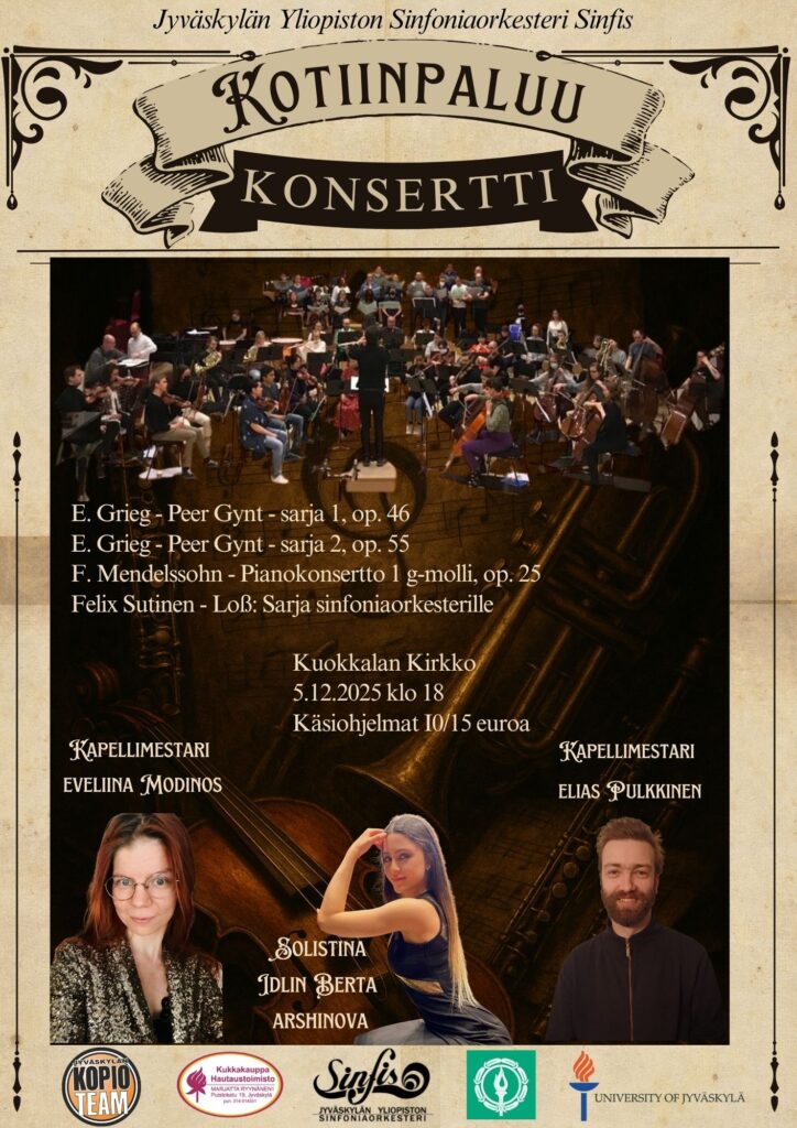 The concert will feature familiar melodies by Edvard Grieg and Felix Mendelssohn. We are also honored to premiere a magnificent piece composed by Felix Sutinen-Loß, who is a former Sinfis player.